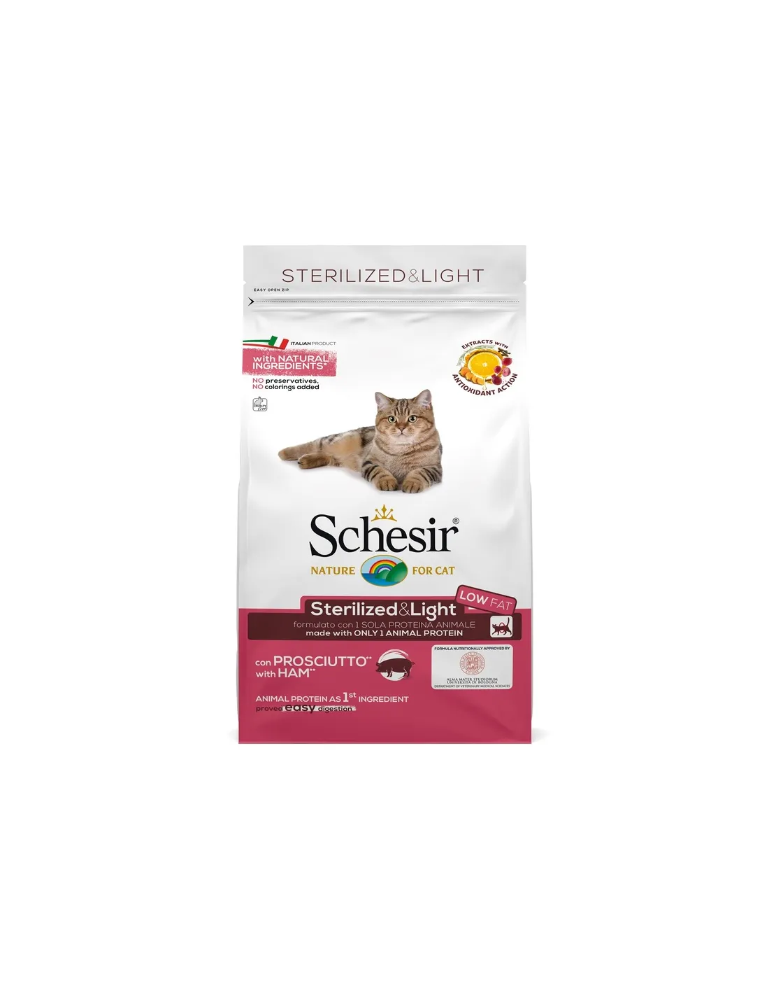 Karma Schesir Cat Sterilized & Light Monoprotein with Ham została opracowana, aby zaspokoić specyficzne potrzeby sterylizowanych kotów. Kastracja może prowadzić do zmian w metabolizmie kotów, czyniąc je bardziej podatnymi na nadwagę i problemy z układem moczowym. Ten produkt pomaga zapobiegać tym problemom dzięki zoptymalizowanemu profilowi odżywczemu. Formuła zawierająca jedno źródło białka zwierzęcego jest idealna dla kotów z wrażliwością pokarmową lub alergiami, a dodatek błonnika wspomaga zdrowe trawienie i kontrolę wagi.