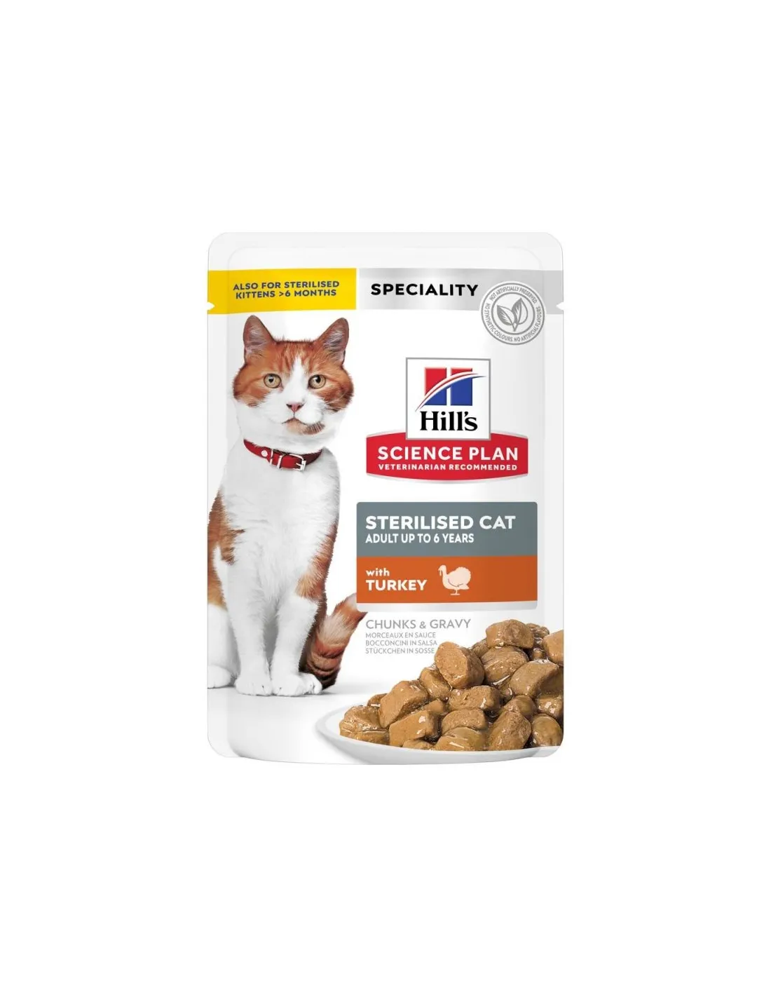 Hill's Science Plan Cat Yadult Sterylized Turkey 85 g w saszetce to mokra karma opracowana specjalnie dla sterylizowanych kotów. Produkt ten został opracowany, aby zaspokoić potrzeby żywieniowe wykastrowanych kotów, pomagając w utrzymaniu ich idealnej wagi i wspierając zdrowie układu moczowego.