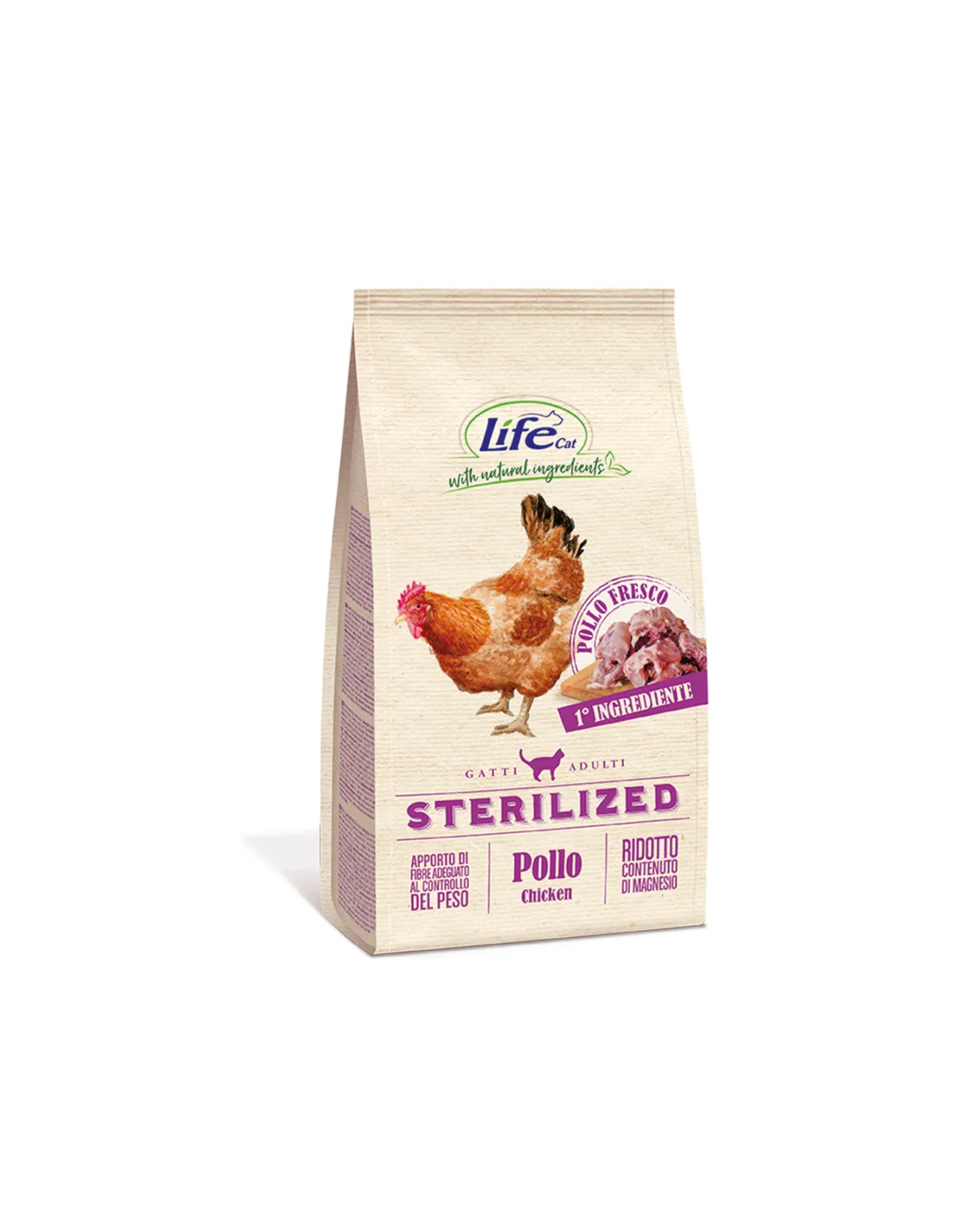 Opisywany produkt to „Life cat sterilizedkurczak KG 1,5”, sucha karma dla kotów sterylizowanych. Ta karma została specjalnie opracowana, aby zaspokoić potrzeby żywieniowe kotów wykastrowanych lub mniej aktywnych fizycznie, z niską zawartością magnezu i odpowiednią zawartością błonnika w celu kontrolowania masy ciała. Zawiera L-karnitynę i selen w formie organicznej, składniki, które przyczyniają się do ogólnego dobrego samopoczucia kota.