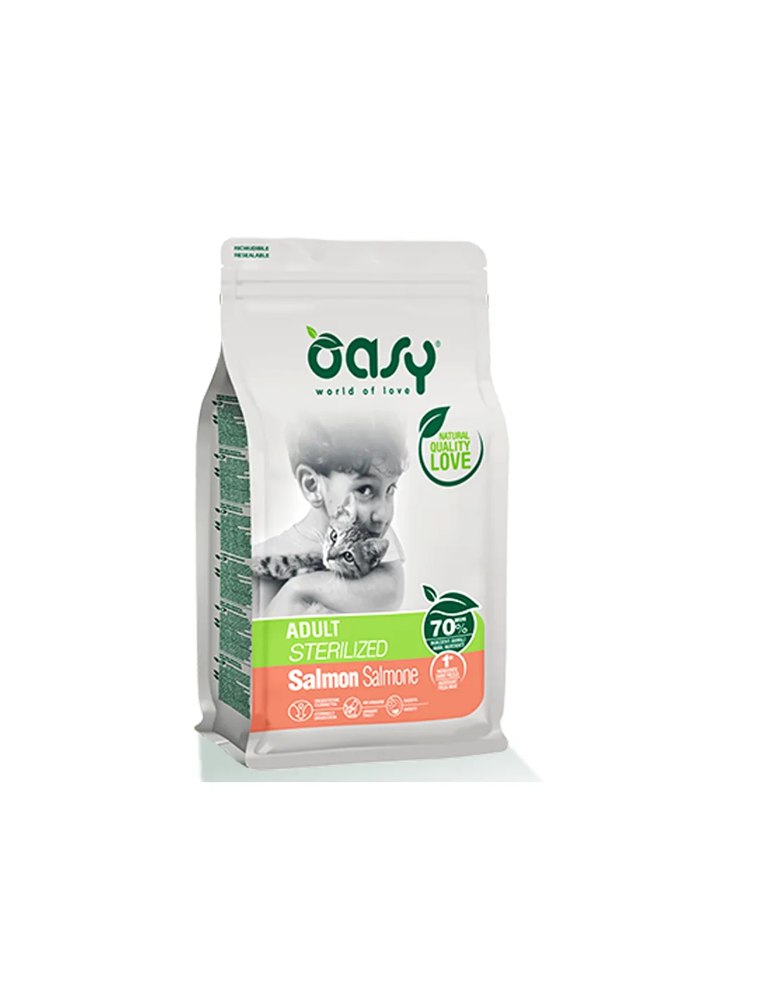 „Adult Sterilized Salmon” firmy Oasy to sucha karma opracowana specjalnie dla dorosłych kotów wysterylizowanych lub wykastrowanych. Produkt ten oferuje smaczny smak łososia i jest dostępny w różnych formatach: 300 g, 1,5 kg i 7,5 kg, dostosowując się w ten sposób do różnych potrzeb właścicieli kotów.