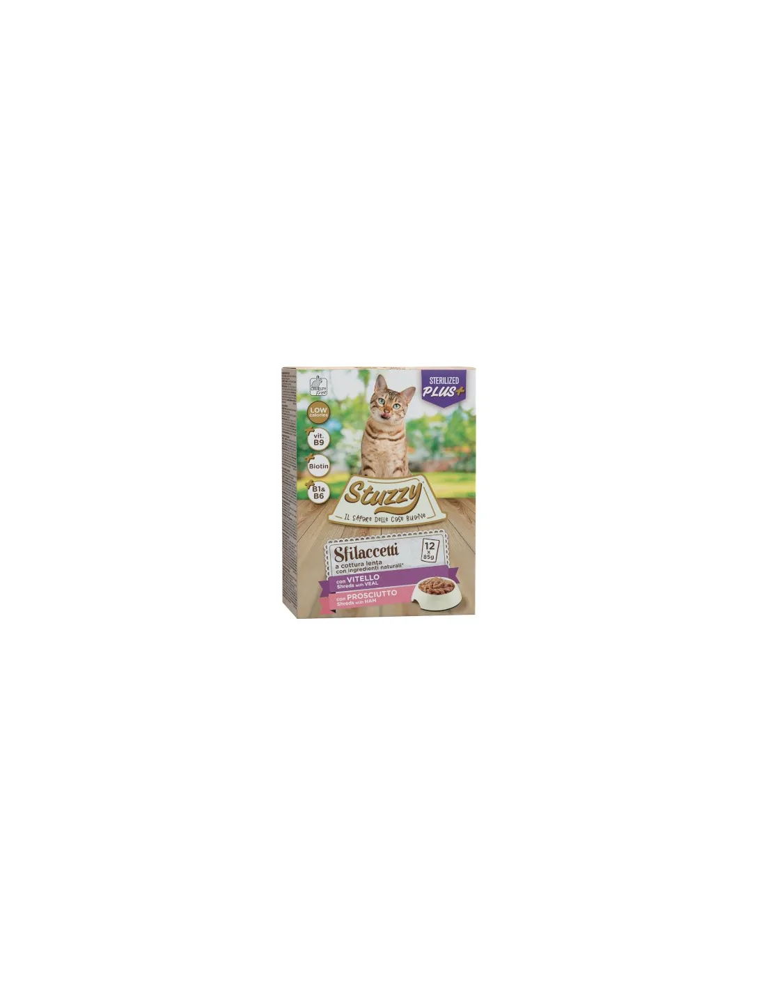 Stuzzy Cat Plus + opakowanie zbiorcze sterylizowanej szynki cielęcej Bust 12 x 85 gr to kompletna i zbilansowana karma, opracowana specjalnie dla sterylizowanych kotów. To opakowanie zbiorcze zawiera plastry cielęciny i szynki, przygotowane z wysokiej jakości naturalnych składników, gotowane powoli, aby zachować autentyczny smak i właściwości odżywcze.