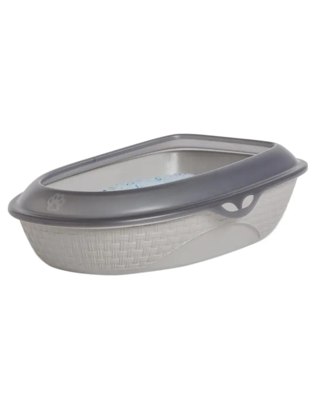 Otwarta kuweta dla kota, wyposażona w osłonę przeciwbryzgową. Elegancki wygląd przypominający słomkę, dostępny w dwóch różnych modnych kolorach, aby dostosować się do każdego rodzaju otoczenia.
