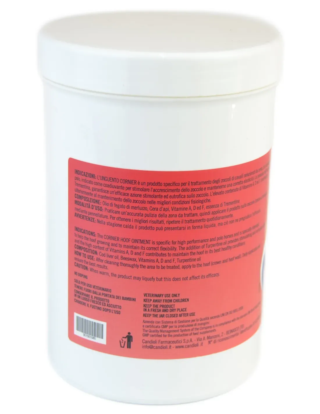 Maść Cornier to specjalistyczny produkt do leczenia kopyt wybranych koni wyścigowych, wyczynowych i polo, wskazany jako środek wspomagający w celu stymulacji wzrostu kopyt i utrzymania prawidłowej elastyczności. Obecność esencji terpentynowej gwarantuje skuteczne działanie stymulujące i eutroficzne na kopyto. Wysoka zawartość witamin a, d i f dodatkowo przyczynia się do utrzymania kopyt w najlepszych warunkach fizjologicznych.