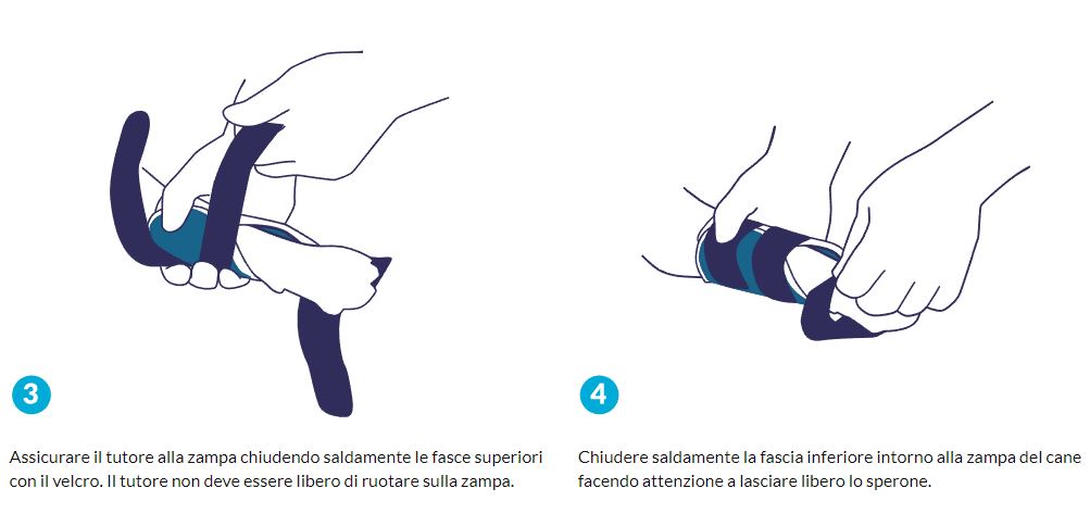 Una volta montato il tutore attorno alla zampa del cane non è necessario che i 2 bordi bianchi siano chiusi attorno alla zampa fino a toccarsi, in quanto la chiusura del tutore è determinata dalle fasce blu e l’azione di tutoraggio è data dalla stecca presente nella parte posteriore del tutore.